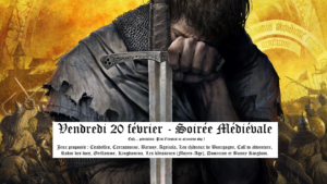 Vendredi 20 février, c’est une soirée jeux spéciale, sur le thème médiéval, avec des jeux associés. Brique ton armure, affûte ton épée (et ton dentier), cire ton bouclier et enfourche ton destrier et rends-toi à partir de 20.30 à la salle de la cour de la Mairie de Bueil, le héraut sonne déjà le rassemblement et l’on prépare la lice.